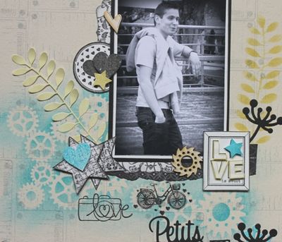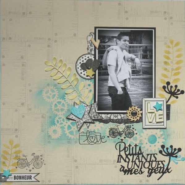 Masque "Engrenages" passé à l'encre Floricolor "Lagon" + Cœur et Engrenage en carton bois.