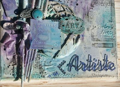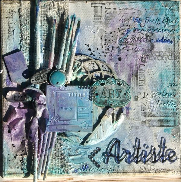Un canvas mixed media qui fait la part belle aux encres, peintures...mais aussi embellissements Embelliscrap! Le fond est travaillé avec le pochoir "ribambelle de bulles" et une encre en spray. Les pinceaux en carton bois , la rosace et le POC "page de scrap" sont recouverts d'une fine couche de gesso puis encrés à l'aide de spray turquoise et mauve. Le mot miroir "Artiste" sert de titre à l'ensemble