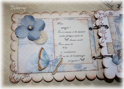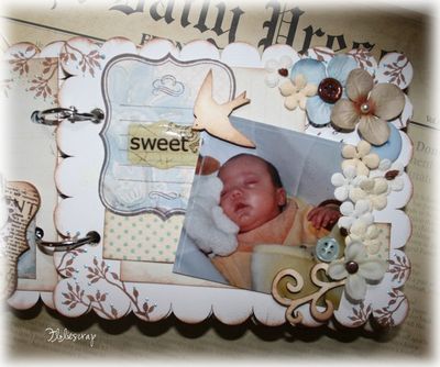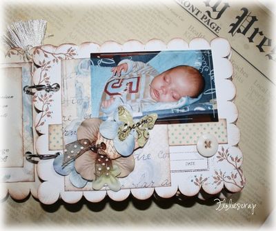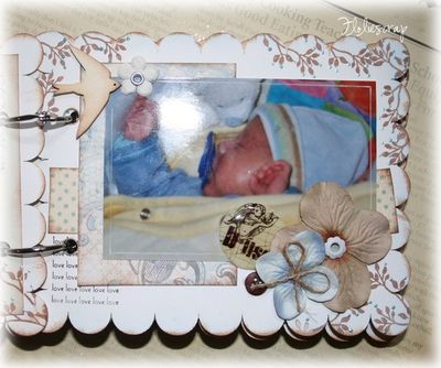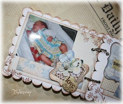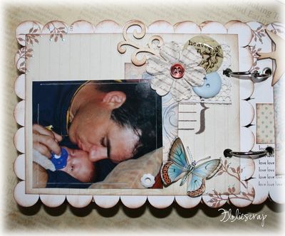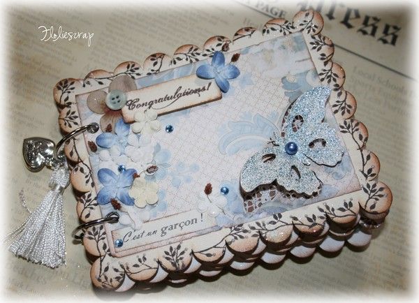 Mini album EmbelliScrap scrappé avec les papiers Daisy D's (Moderne romance), MME et Scenic Route sur fond de bazzill blanc sur mon fils.