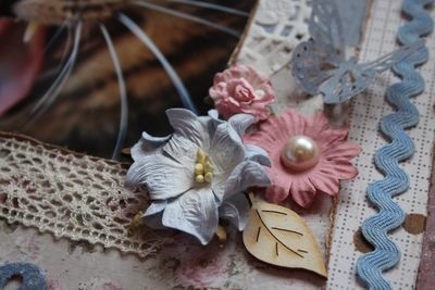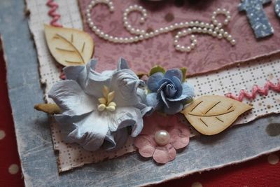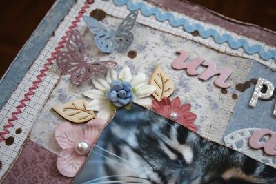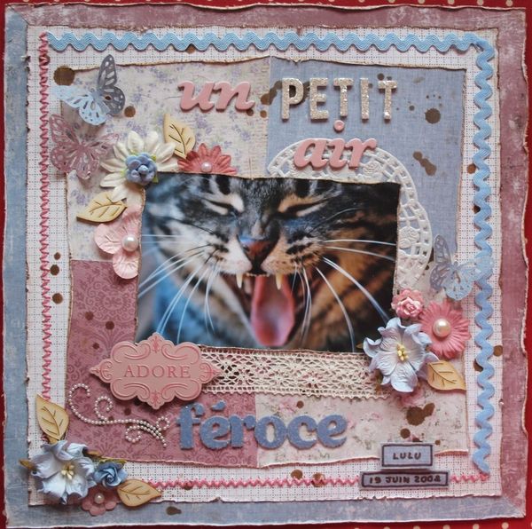 J'avais envie de faire une page très shabby avec une touche d'humour dans le titre pour mettre en valeur cette photo de ma Lulu en train de bailler. J'ai utilisé de la couture, des couleurs tendres, du croquet, de la dentelle, des petites tâches d'encre, des papillons, des fleurs et ces jolies petites feuilles embelliscrap. |