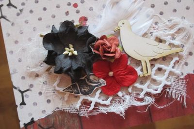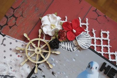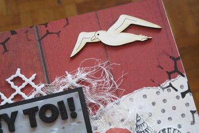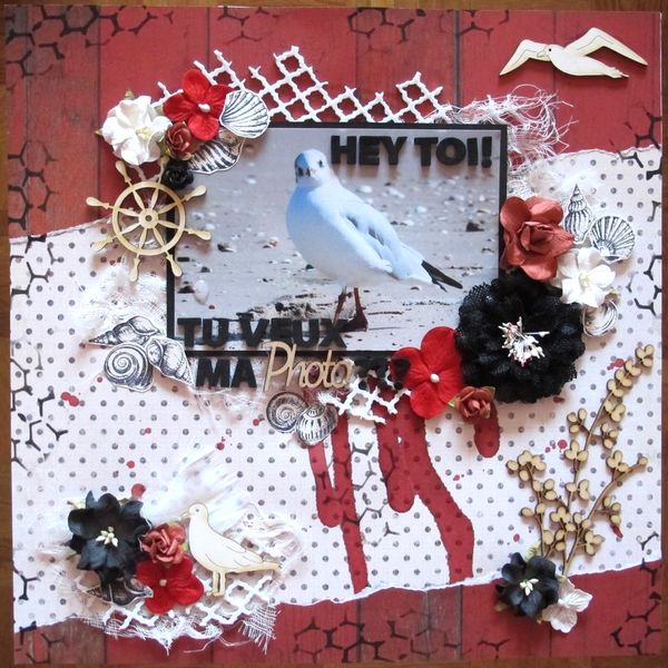 | Après avoir fait des coulures d'encre sur mon papier de fond j'ai ajouté du papier déchiré en haut et en bas de ma page. Sous ma photo et en bas j'ai mis de la gaze déchirée et étirée, et de la creamousse découpée avec un die. J'ai décoré avec des fleurs, des plumes, des embellisseents en bois, et des coquillages tamponnés et découpés, collés pour certains sur de la mousse 3D, et enfin j'ai ajouté des petites touches au pochoir et à l'encre noir autour de ma page. |