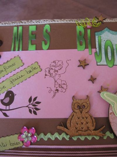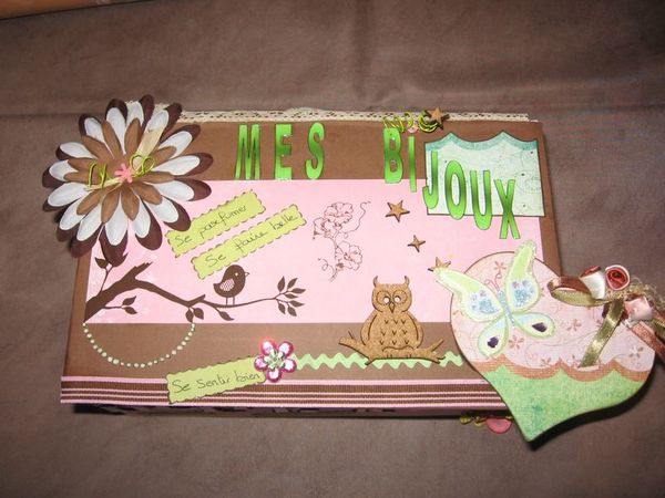 | Pour l'anniversaire de ma soeur, une boîte à bijoux faite avec une boite à chaussure et embéllit avec du papier, liège hibou, tampon, fleurs...