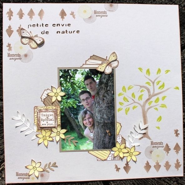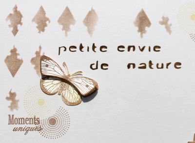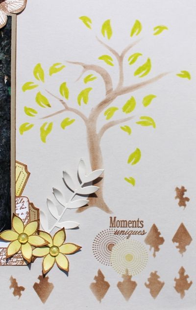 Titre du pochoir passé au feutre Floricolor Chocolat, Feutre Floricolor Havane pour les fleurs de l'arbre et les triangles usés avec la Versafine Sépia. Thalie