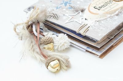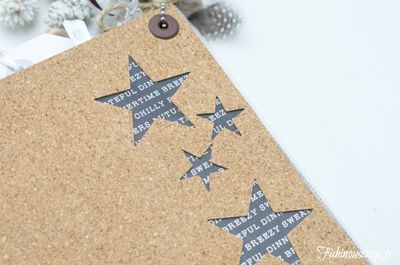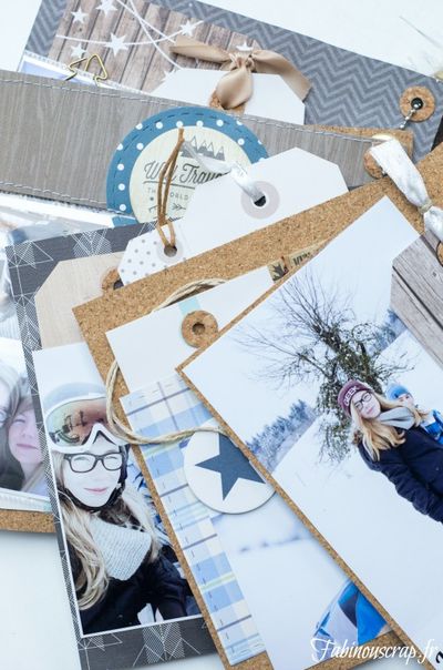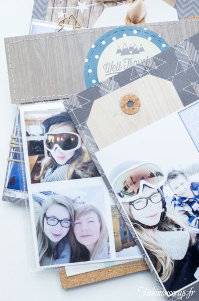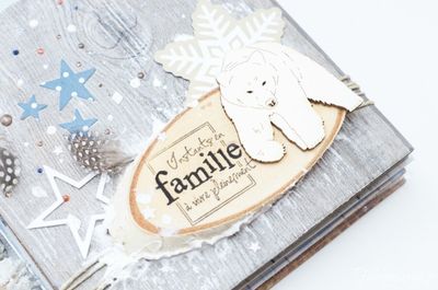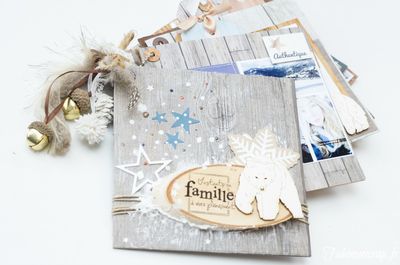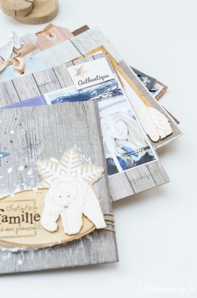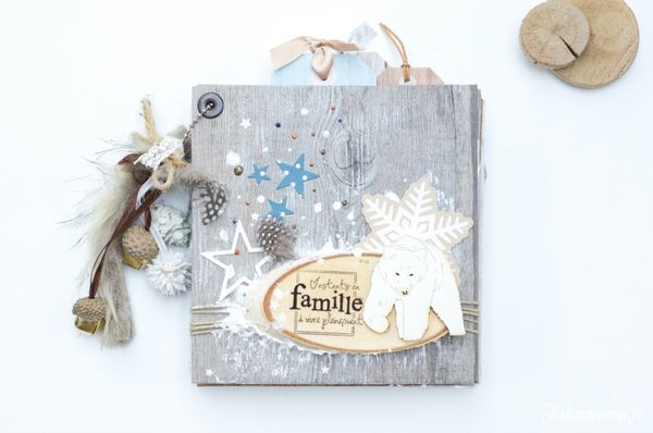 L'album dans des tonalités neutres et bleu/gris, se compose de papiers aspect bois, bois, liège, cuir, tissu, bref de nombreux matériaux différents.