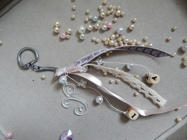 Un porte clef avec des dentelles , des rubans , des perles et une arabesque transparente qui apporte rondeur, douceur et légèreté... |
