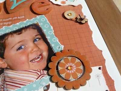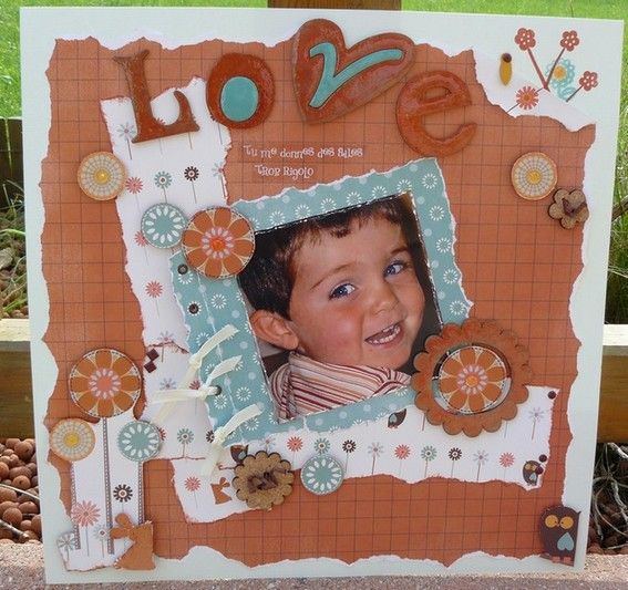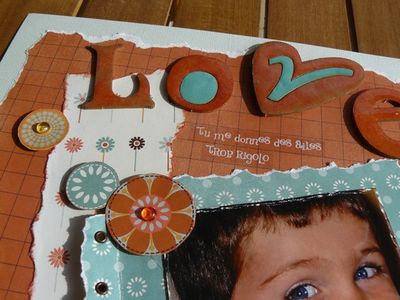 Le mot love en carton d'embelliscrap et deux fleurs en liège également. Le contour fleur est une récup du contour de la lettre E de love.