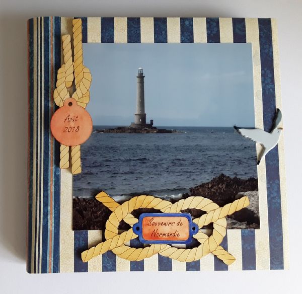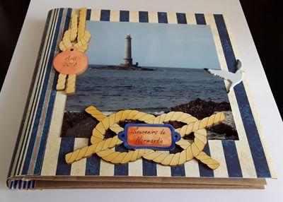 Voici un petit album photos que j'ai réalisé pour y mettre des photos de vacances. La photo vous montre la couverture de cet album, sur laquelle j'ai collé des embellissements de la boutique EmbelliScrap, personnalisés pour l'occasion. Je les ai peints à l'aquarelle.