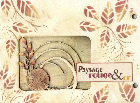 Le dos de l'album est coloré avec des encreurs et le pochoir feuillage. Le mot Paysage Rouge & or complète l'ambiance.