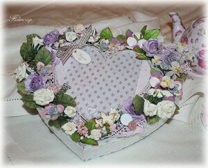 Joli coeur en plexi scrappé et décoré de points 3D, inséré dans une boîte "fait main" ornée d'embellibidules au milieu des fleurs.