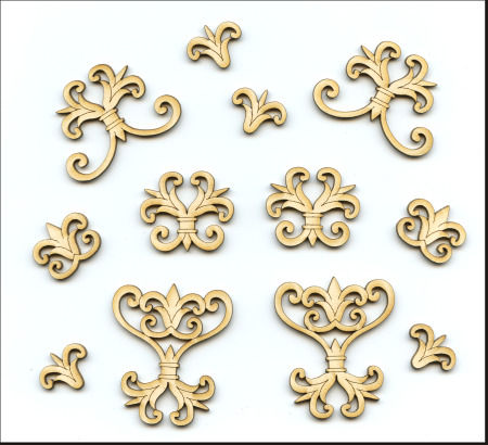 Voici 12 très jolies volutes de lys, qui seront parfaites à utiliser dans des angles sur vos réalisations. Les plus grandes mesurent 4.5 cm par 4 cm. Les deux moyennes mesurent 4 cm par 3. Deux plus petites font 3 par 2.5 cm. Quant aux 6 mini fleurs de lys, elles font environ 1.5 par 2 cm.