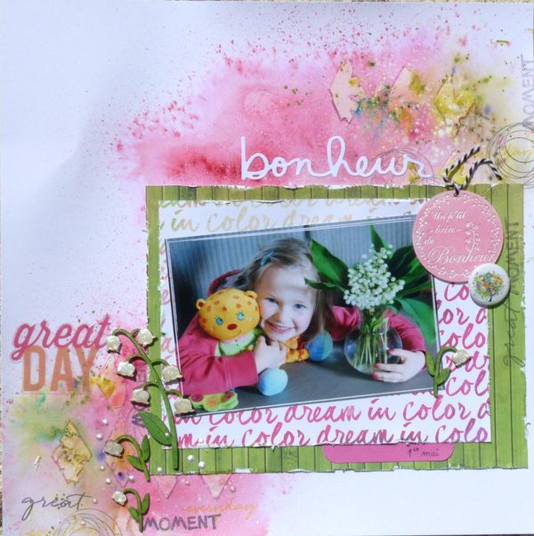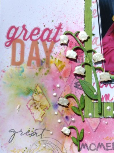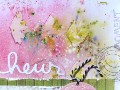 Le fond est travaillé avec le pochoir losange, du gesso et des poudres Brusho. le grand POC "Un p'tit brin de bonheur" est teinté avec un encreur rose et les brins de muguet sont mis en couleur avec un gelato vert et de la peinture relief blanc irrisé.