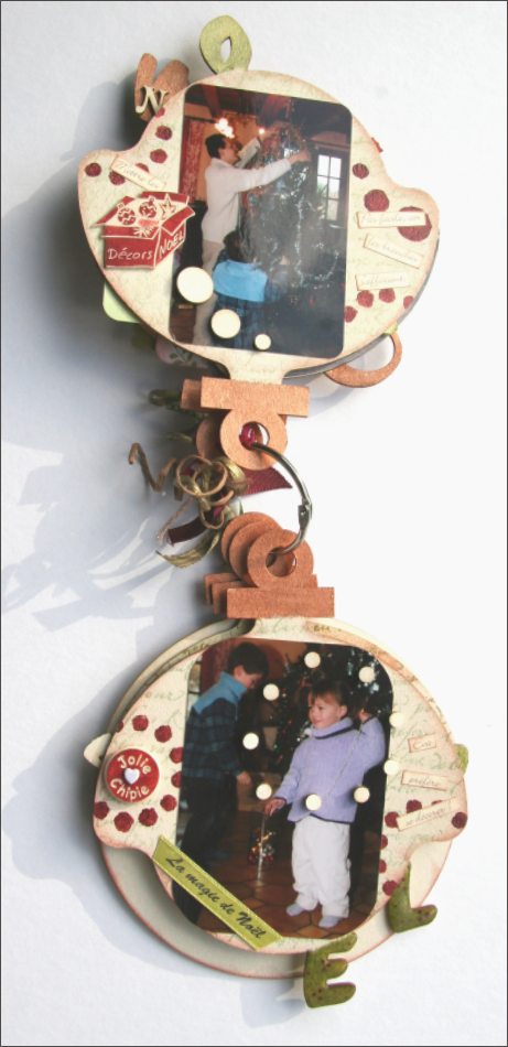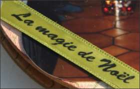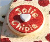 Pour les embellissements, ajouter la rondelle Jolie Chipie, avec une attache parisienne petit coeur à l'intérieur. Coller au double face sur le photo un morceau de ruban imprimé.