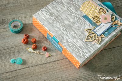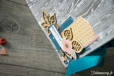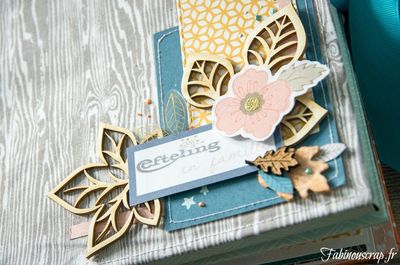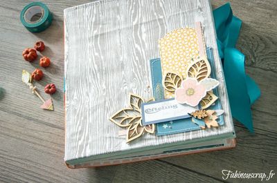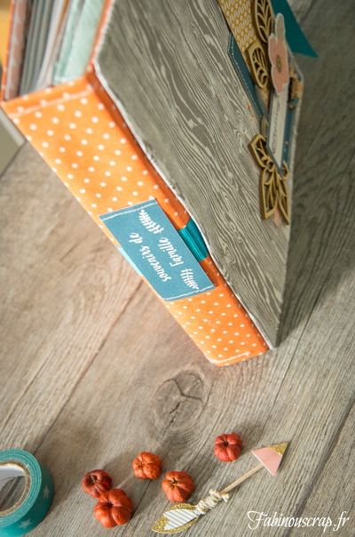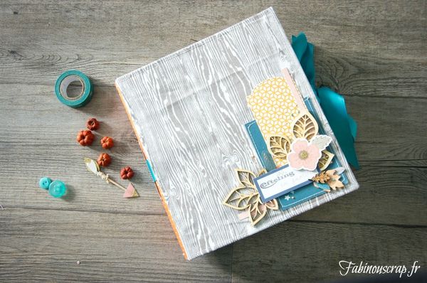 Mon album est recouvert de tissu, et les embellissements EmbelliScrap complètent très bien le thème de l'automne.