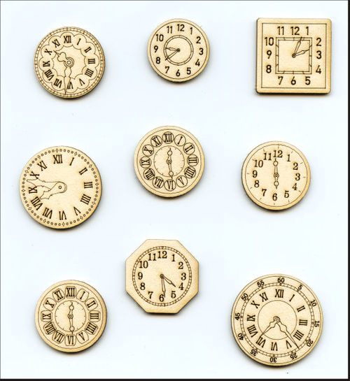 Je me suis amusée à mettre des heures différentes sur chaque horloge. Mon idée, si j'avais le temps de scrapper, serait de faire un mini album sur une journée bien remplie, où chaque moment de la journée serait ponctué par une horloge : 6h du matin, réveil, 7h30, réveil des enfants, 8h45, les enfants sont à l'école... A vous d'imaginer ce que vous pourriez faire, si l'idée vous amuse ;-) !